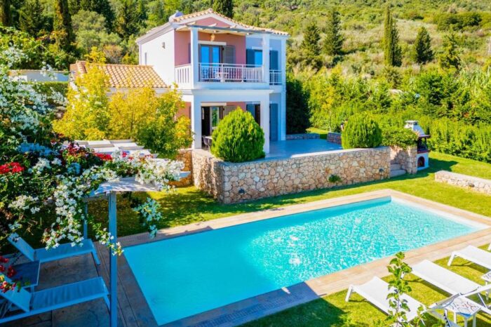 The villas are built amphitheatrically across the verdant hill of Nikiana on two levels, offering a captivating view of the Ionian Sea, with private pool and full amenities needed for your luxury stay!
